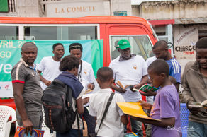 The Bibliobus travels around Goma a few times a year bringing books to people from all walks of life. The Bibliobus stops in neighborhoods where volunteers talk to people about where the closest library is to them, provide books for people to read and talk to people about the importance of reading. People of all ages are invited to borrow a book and read it on board the bus. Whenever the Bibliobus stops, it quickly fills with people who wanted to read the available books.